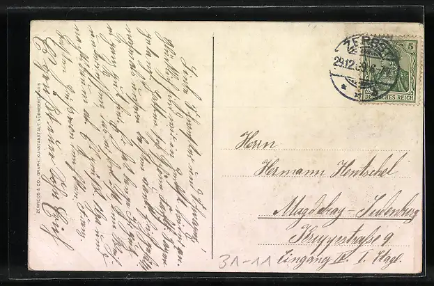 Personenbezogene Daten auf der Rückseite der Karte wurden durch blauen Textmarker unkenntlich gemacht. Die blauen Stellen sind auf die Vorderseite durchgeweicht und wirken sich negativ auf das Postkartenfoto aus