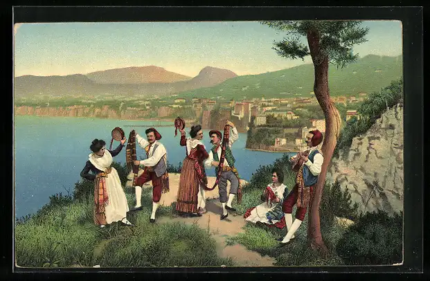 AK Männer und Frauen in spanischer Tracht beim Tanzen, mit Küstenpanorama