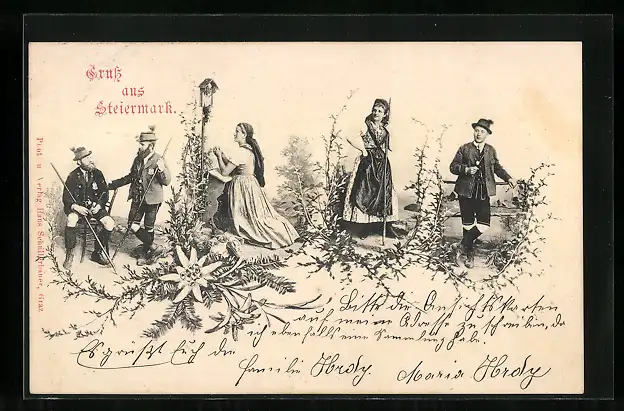 AK Männer und Frauen mit Wanderstöcken in steirischen Trachten