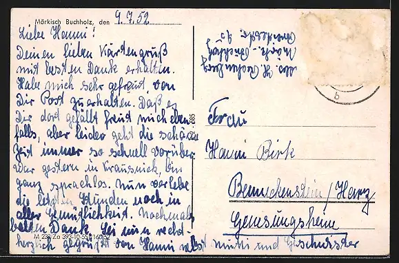 alte Ansichtskarte, gelaufen 1952, Briefmarke entfernt, rückseitig Oberflächenschaden, guter Zustand