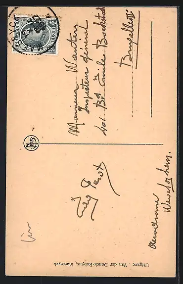 Personenbezogene Daten auf der Rückseite der Karte wurden durch blauen Textmarker unkenntlich gemacht. Die blauen Stellen sind auf die Vorderseite durchgeweicht und wirken sich negativ auf das Postkartenfoto aus