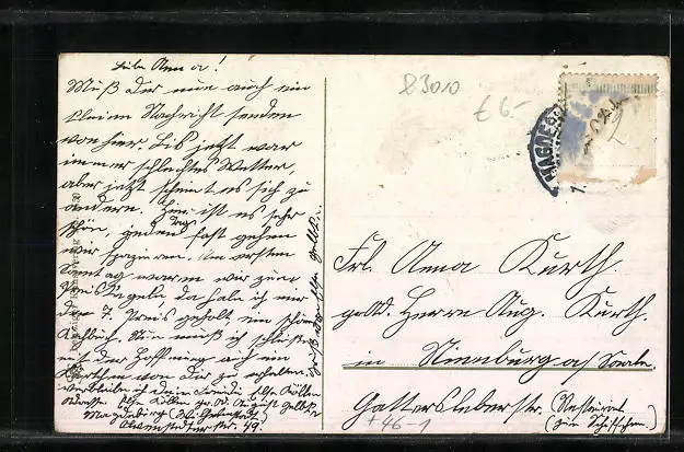 Personenbezogene Daten auf der Rückseite der Karte wurden durch blauen Textmarker unkenntlich gemacht. Die blauen Stellen sind auf die Vorderseite durchgeweicht und wirken sich negativ auf das Postkartenfoto aus