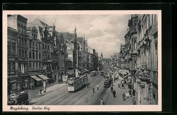 AK Magdeburg, Breiter Weg mit Strassenbahn