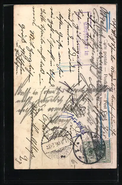 Personenbezogene Daten auf der Rückseite der Karte wurden durch blauen Textmarker unkenntlich gemacht. Die blauen Stellen sind auf die Vorderseite durchgeweicht und wirken sich negativ auf das Postkartenfoto aus