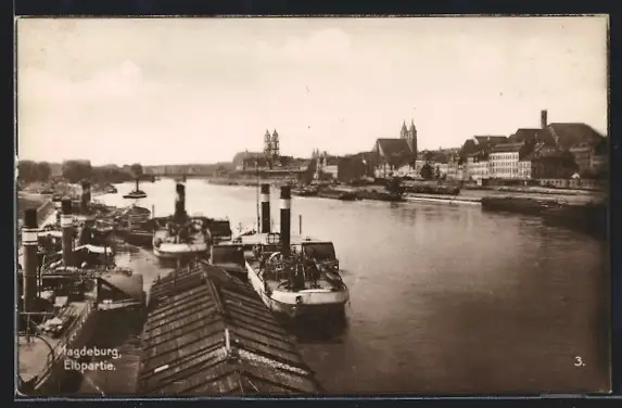 AK Magdeburg, Elbpartie mit Frachtschiffen
