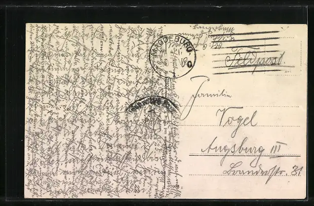 Personenbezogene Daten auf der Rückseite der Karte wurden durch blauen Textmarker unkenntlich gemacht. Die blauen Stellen sind auf die Vorderseite durchgeweicht und wirken sich negativ auf das Postkartenfoto aus