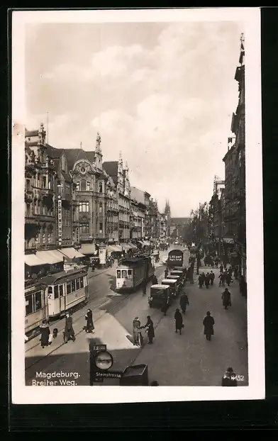 AK Magdeburg, Strasse Breiter Weg mit Geschäften und Strassenbahn