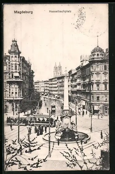 AK Magdeburg, Strassenbahn auf dem Hasselbachplatz
