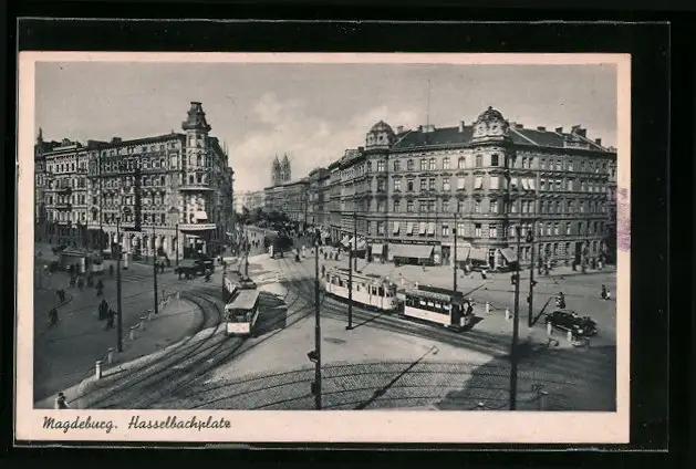 AK Magdeburg, Strassenbahnen auf dem Hasselbachplatz