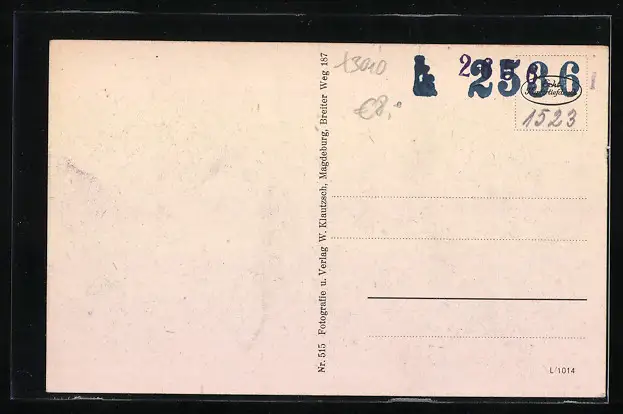 Personenbezogene Daten auf der Rückseite der Karte wurden durch blauen Textmarker unkenntlich gemacht. Die blauen Stellen sind auf die Vorderseite durchgeweicht und wirken sich negativ auf das Postkartenfoto aus