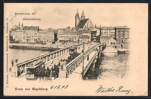 AK Magdeburg, Strombrücke mit Strassenbahn und Johanniskirche