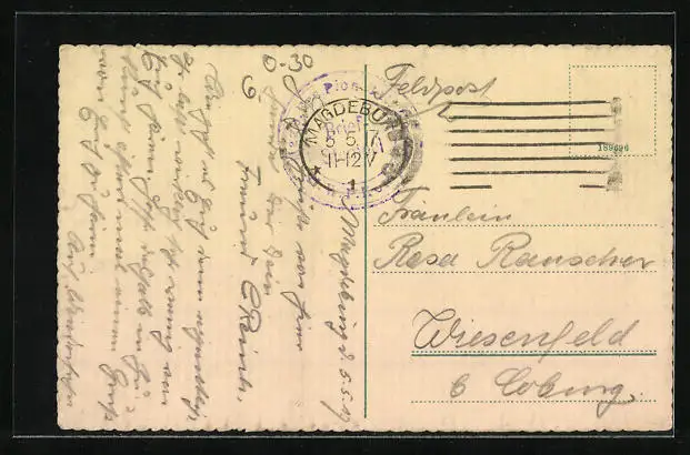 Personenbezogene Daten auf der Rückseite der Karte wurden durch blauen Textmarker unkenntlich gemacht. Die blauen Stellen sind auf die Vorderseite durchgeweicht und wirken sich negativ auf das Postkartenfoto aus