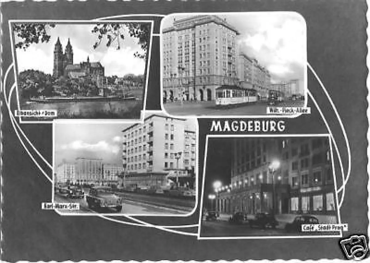 Ansichtskarte, Magdeburg vier Abb., gestaltet, Dom, Wilhelm-Pieck-Allee mit Straßenbahn, Karl-Marx-Str., Café "Stadt Prag" - Nachtansicht Erhaltung I ungelaufen Druckvermerk: 1966 Herstellungsland: DDR Verlag: KONSUM FOKU Magdeburg - A3204