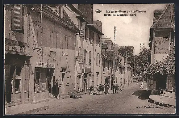 AK Magnac-Bourg, Route de Limoges avec passants et commerces