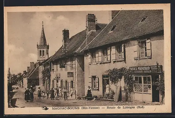 AK Magnac-Bourg, Route de Limoges avec vue sur l`église et les commerces