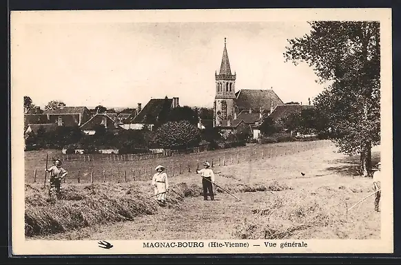 AK Magnac-Bourg, Vue générale avec église et habitants travaillant dans les champs
