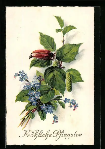 AK Maikäfer an Birkenzweig mit Vergissmeinnicht, Pfingstgruss