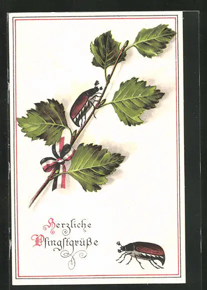 AK Maikäfer an einem Zweig mit Fahnenband, Pfingstgruss