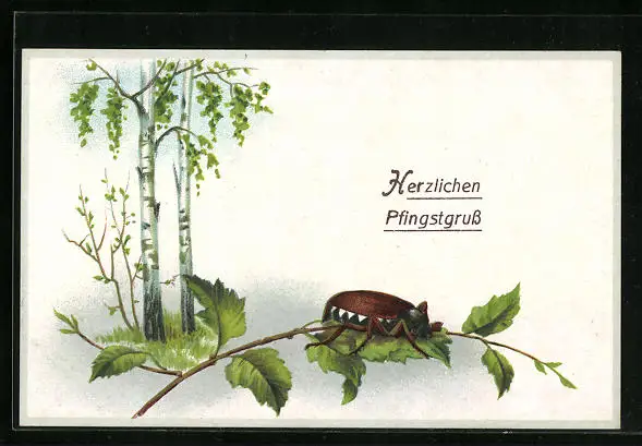 AK Maikäfer auf Birkenzweig, Pfingstgruss