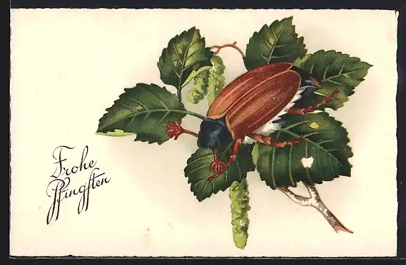 AK Maikäfer auf Birkenzweig, Pfingstgruss