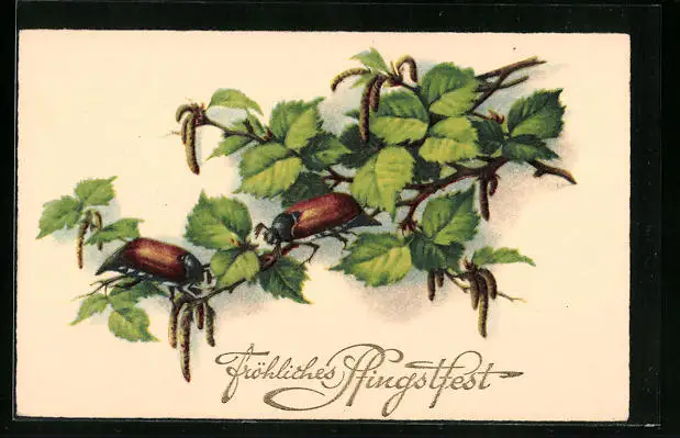 AK Maikäfer auf Birkenzweigen, Pfingstgruss
