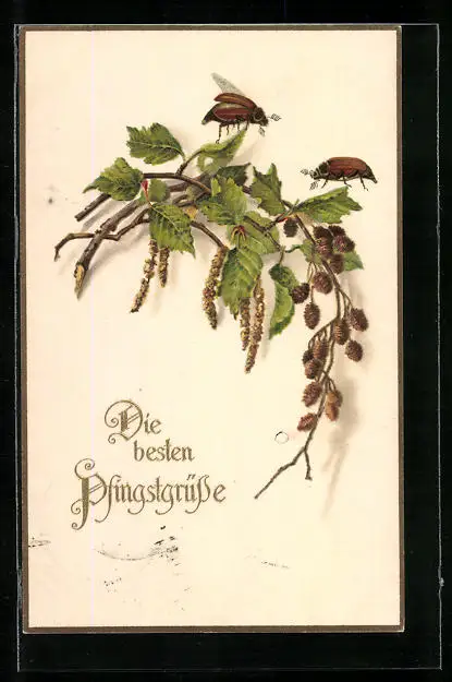 AK Maikäfer auf angefressenem Zweig, Pfingstgruss