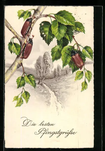 AK Maikäfer auf einer Birke, Pfingstgruss