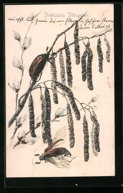 AK Maikäfer krabbeln auf einem Zweig, Fröhliche Pfingsten