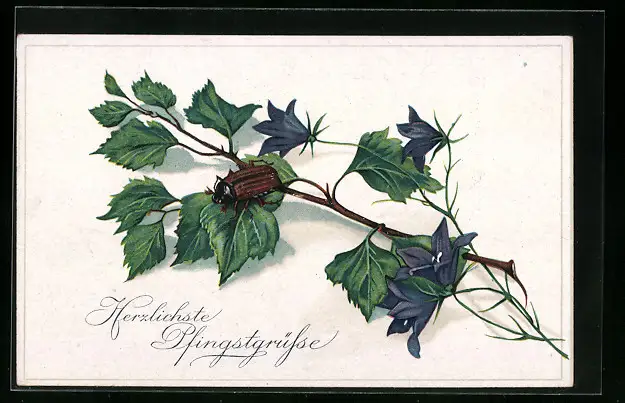 AK Maikäfer krabbelt auf einem Birkenzweig, Pfingstgruss