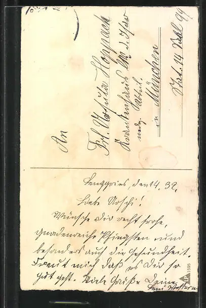 Personenbezogene Daten auf der Rückseite der Karte wurden durch blauen Textmarker unkenntlich gemacht. Die blauen Stellen sind auf die Vorderseite durchgeweicht und wirken sich negativ auf das Postkartenfoto aus