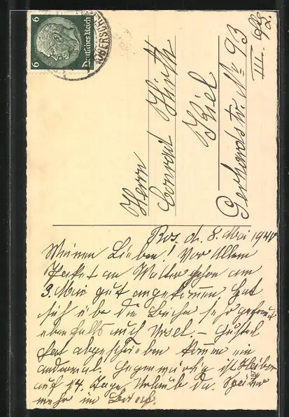 Personenbezogene Daten auf der Rückseite der Karte wurden durch blauen Textmarker unkenntlich gemacht. Die blauen Stellen sind auf die Vorderseite durchgeweicht und wirken sich negativ auf das Postkartenfoto aus