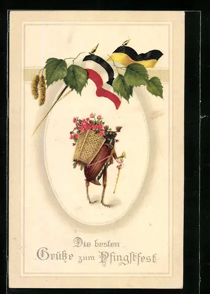 AK Maikäfer mit Wanderstock und Blumenkorb, Fahnen des Zweibunds, Pfingstgruss