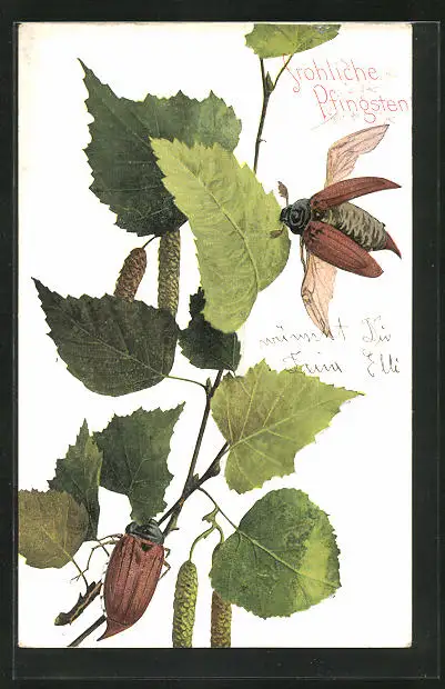 AK Maikäfer sitzen auf einem Ast, Fröhliche Pfingsten!