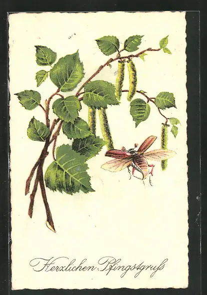 AK Maikäfer und Zweige mit Blättern, Pfingstgruss