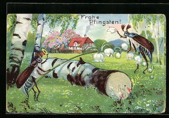 AK Maikäferpaar beim Abschied mit Maiglöckchenzweig, Pfingstgruss