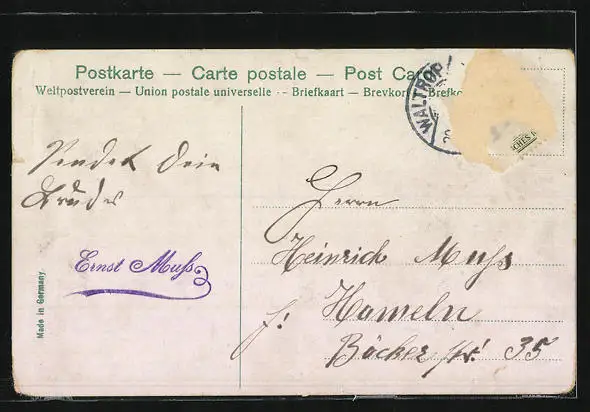 alte Ansichtskarte, gelaufen, Briefmarke entfernt, rückseitig Oberflächenschaden, Ecken bestoßen, Einriss re. Mitte, guter Zustand
