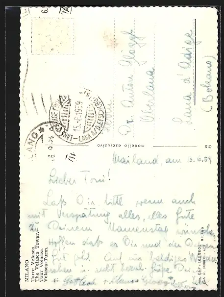 gelaufen 1959, Briefmarke entfernt, Eckknick li. unten, guter Zustand