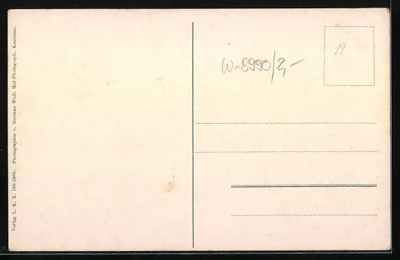Personenbezogene Daten auf der Rückseite der Karte wurden durch blauen Textmarker unkenntlich gemacht. Die blauen Stellen sind auf die Vorderseite durchgeweicht und wirken sich negativ auf das Postkartenfoto aus