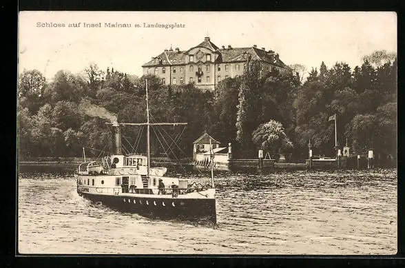 AK Mainau, Schloss mit Landungsplatz und Dampfer