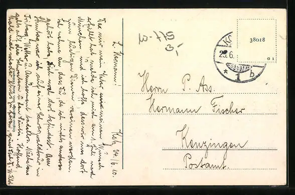 alte Ansichtskarte, gelaufen 1910, Briefmarke entfernt, rückseitig Oberflächenschaden, Eckknick li. oben, minimaler Einriss li. oben, guter Zustand
