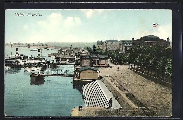 AK Mainz, Dampfer am Rheinufer