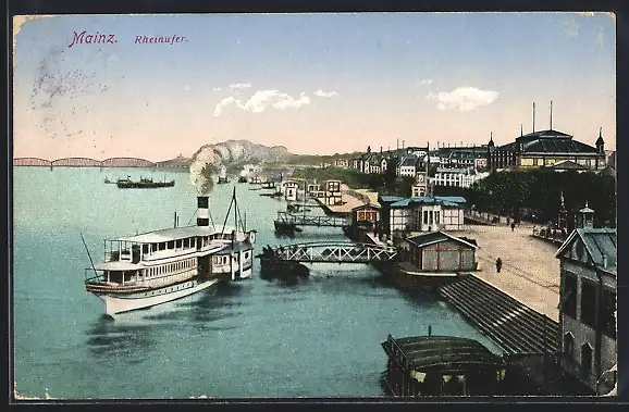AK Mainz, Dampfer am Rheinufer