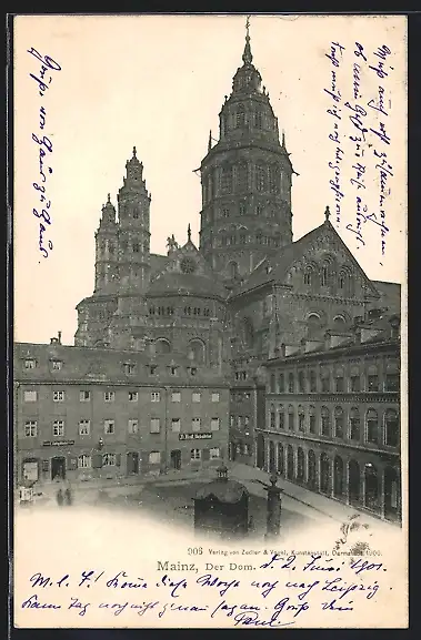 AK Mainz, Dom mit Strassenpartie und Geschäften