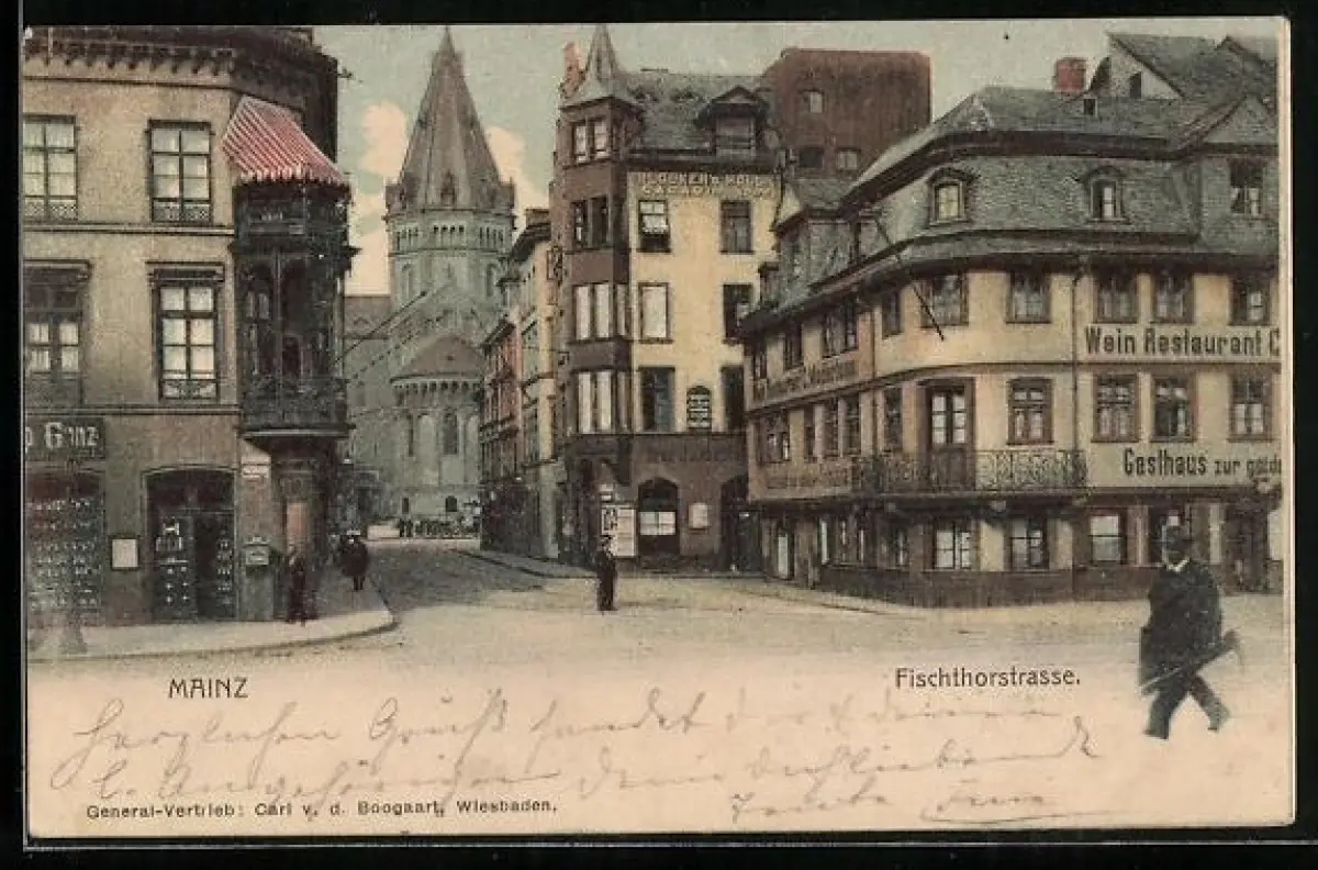 AK Mainz, Fischtorstrasse, Gasthaus mit Strassenpartie