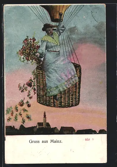 AK Mainz, Frau im Ballon wirft Blumen über der Stadt ab