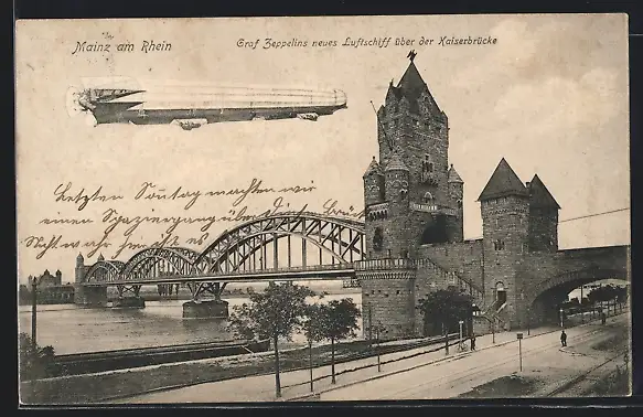 AK Mainz, Graf Zeppelins neues Luftschiff über der Kaiserbrücke