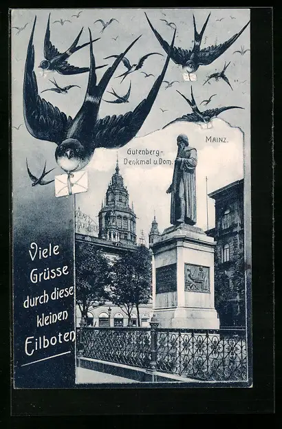AK Mainz, Gutenberg Denkmal und Dom, Schwalbe mit Brief