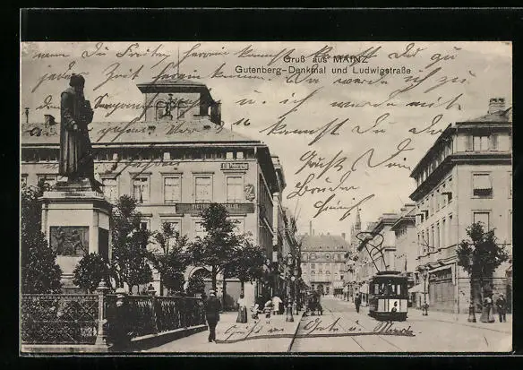 AK Mainz, Gutenberg-Denkmal und Ludwigstrasse, Strassenbahn