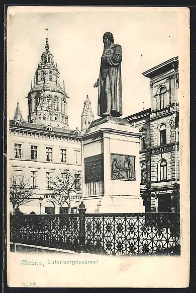 AK Mainz, Gutenbergdenkmal vor der Frankfurter Zeitung