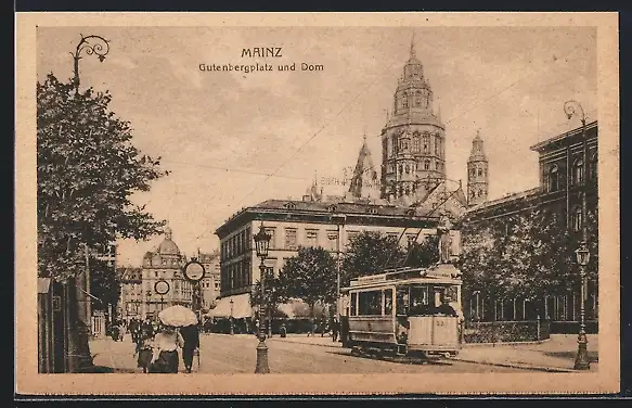 AK Mainz, Gutenbergplatz mit Dom und Strassenbahn